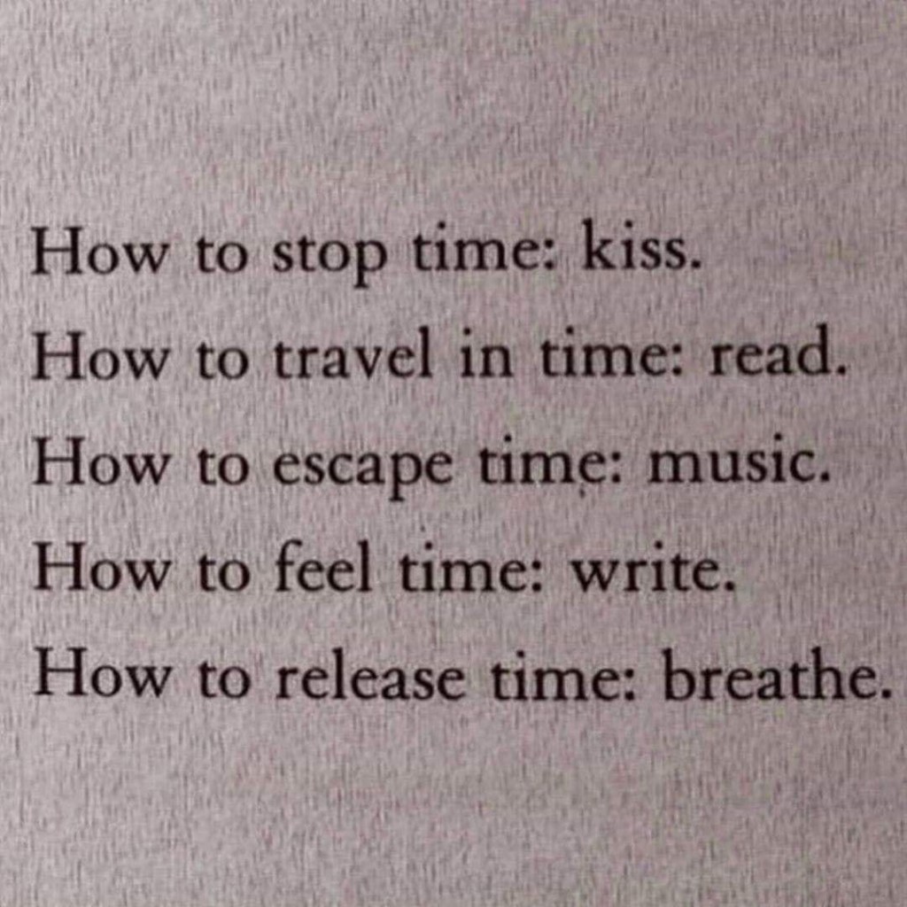 How to stop time: kiss. How to travel in time: read. How to escape time: music. How to feel time: write. How to release time: breathe!