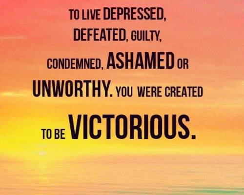 You were never created to live depressed, defeated, guilty, condemned, ashamed or unworthy. You were created to be victorious.