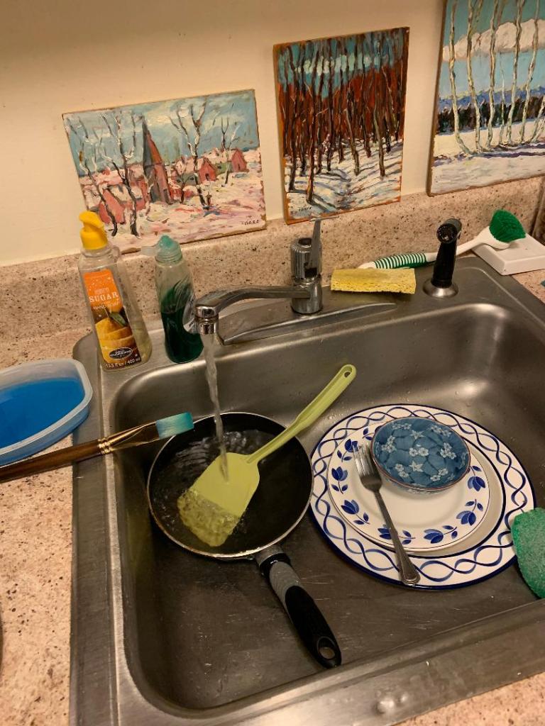 Wash your dishes first, before you wash your paint brushes! You don’t want to get paint all over them, right?!