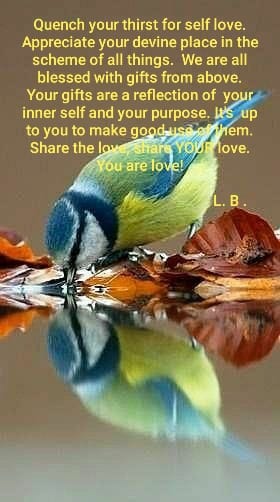 “Quench your thirst for self love. Appreciate your divine place in the scheme of things. We are all blessed with gifts from above. Your gifts are a reflection of your inner self and your purpose. It’s up to you to make good use of them. Share the love, share YOUR love. You are love!” – L.B.