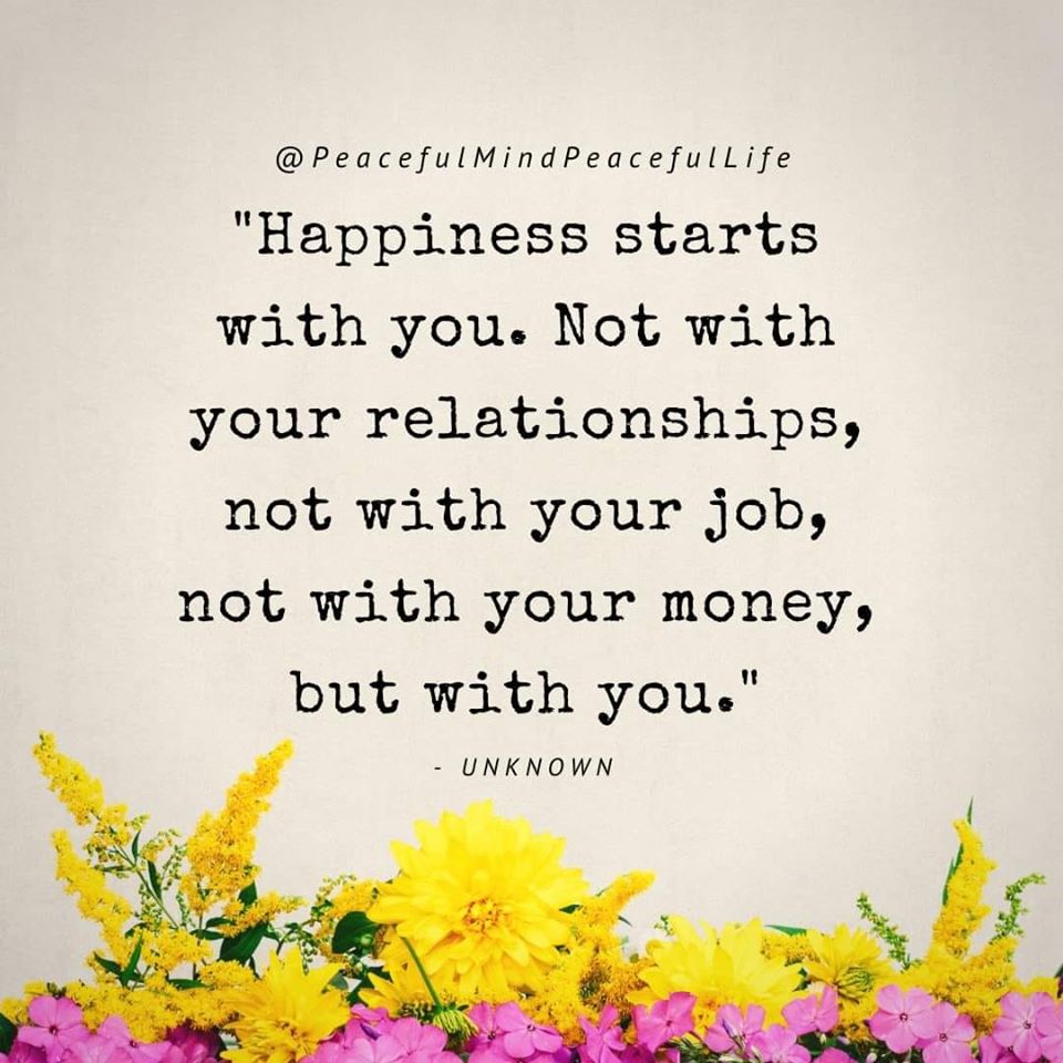 - Happiness starts with you. Not with your relationships, not with your job, not with your money, but with you!