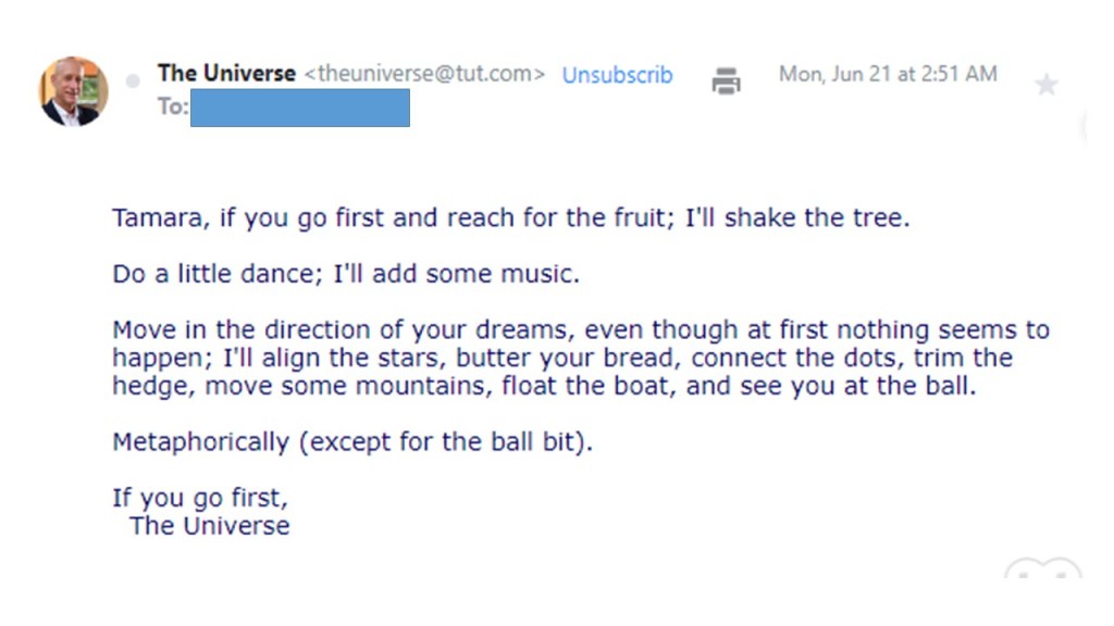 I subscribe to “Notes from the Universe” from www.tut.com. Not all the messages are spot on or relate to a post I’m writing about, but when I need a shot of encouragement, I usually get a lovely one, just like this one today! I highly recommend subscribing to this daily email, and you may find that the message for the day is exactly what you need!