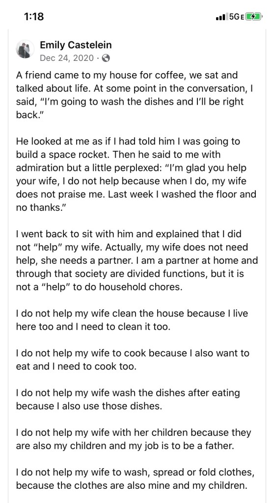 Women have learned to become Martyrs from their moms or other female figures, taking on too much of the load, and then becoming angry and resentful because they’re now working full time and expected to also do all the housework and childcare.