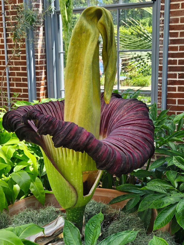 As you can see, the commanding spire was already collapsing, and the dreadful smell wasn’t as powerful as when it first opened. The bad smelling flower gets its name because when it opens it smells like a rotting corpse. You can compare its size to the window panes behind, it is a massive blossom to behold.