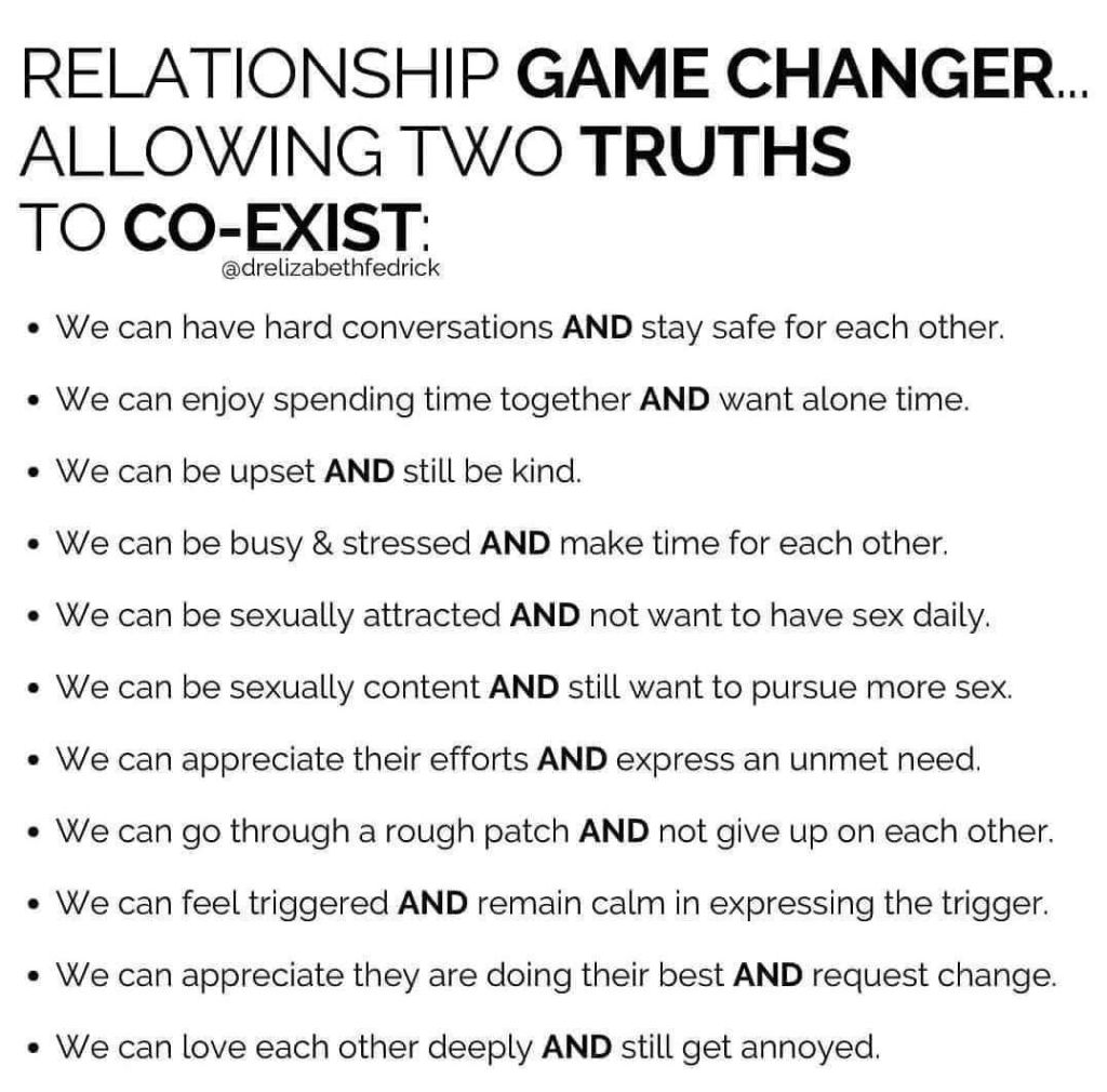 1. The truth that speaks most to me is the last one: “We can love each other deeply AND still get annoyed.” I can think of a number of relationships in the past that have ended because of our failure to accept this truth.
