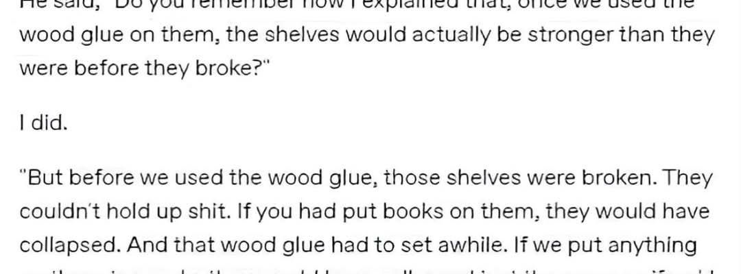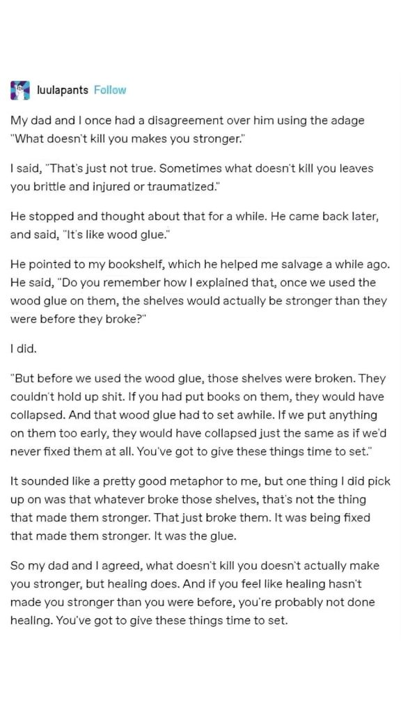My dad and I once had a disagreement over him using the adage “What doesn’t kill you makes you stronger.” I said, “That’s just not true. Sometimes what doesn’t kill you leaves you brittle and injure or traumatized.” He stopped and thought about that for a while. He came back later and said, It’s like wood glue.” He pointed to my bookshelf which he helped me salvage a while ago. He said, “Do you remember how I explained that once we used to wood glue on them, the shelves would actually be stronger than before they broke?” I did. “But before we used the wood glue, those shelves were broken. They couldn’t hold up shit. If you had put books on them, they would have collapsed. And that wood glue had to set a while. If we put anything on them too early, they would have collapsed just the same as if we had never fixed them at all. You have to give these things time to set.” It did sound like a pretty good metaphor to me, but one thing I did pick up on was that whatever broke those shelves, that’s not the thing that made them stronger. That just broke them. It was being fixed that made them stronger. It was the glue. So my dad and I agreed, what doesn’t kill you doesn’t actually make you stronger, but healing doe. And if you feel like healing hasn’t made you stronger than you were before, you’re probably not done healing. you’ve got to give things time to set.